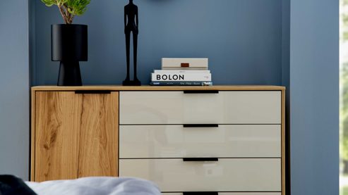 Die Interliving Schlafzimmer Serie 1034 bietet vielfältige Ergänzungsmöglichkeiten – von passenden Drehtürenschränken über Bettgestelle bis hin zu wandhängenden Nachtkonsolen. Kombiniere die Kommode mit beleuchteten Paneelen oder einem Passepartout mit LED-Beleuchtung, um dein Schlafzimmer stimmungsvoll abzurunden.