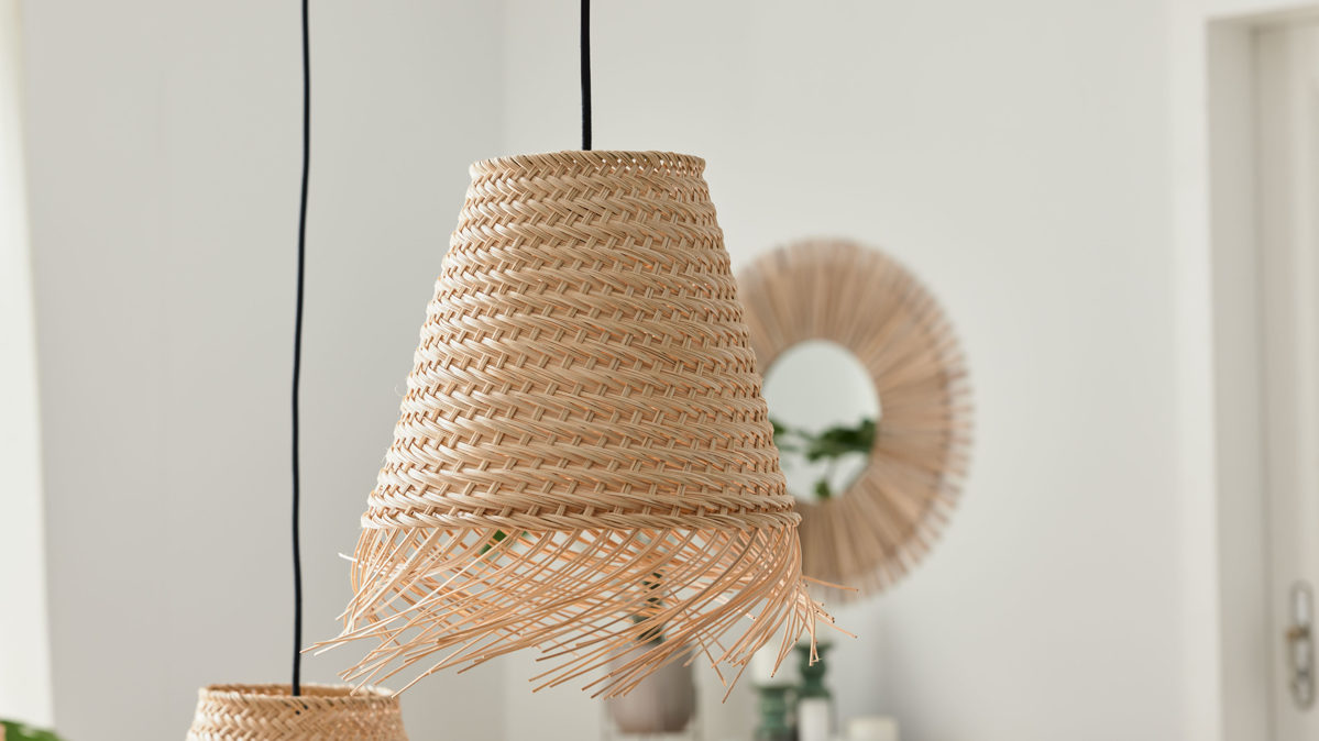 naturfarbenes Seegrasgeflecht, kombiniert mit schwarzem Metall und schwarzem Textilkabel