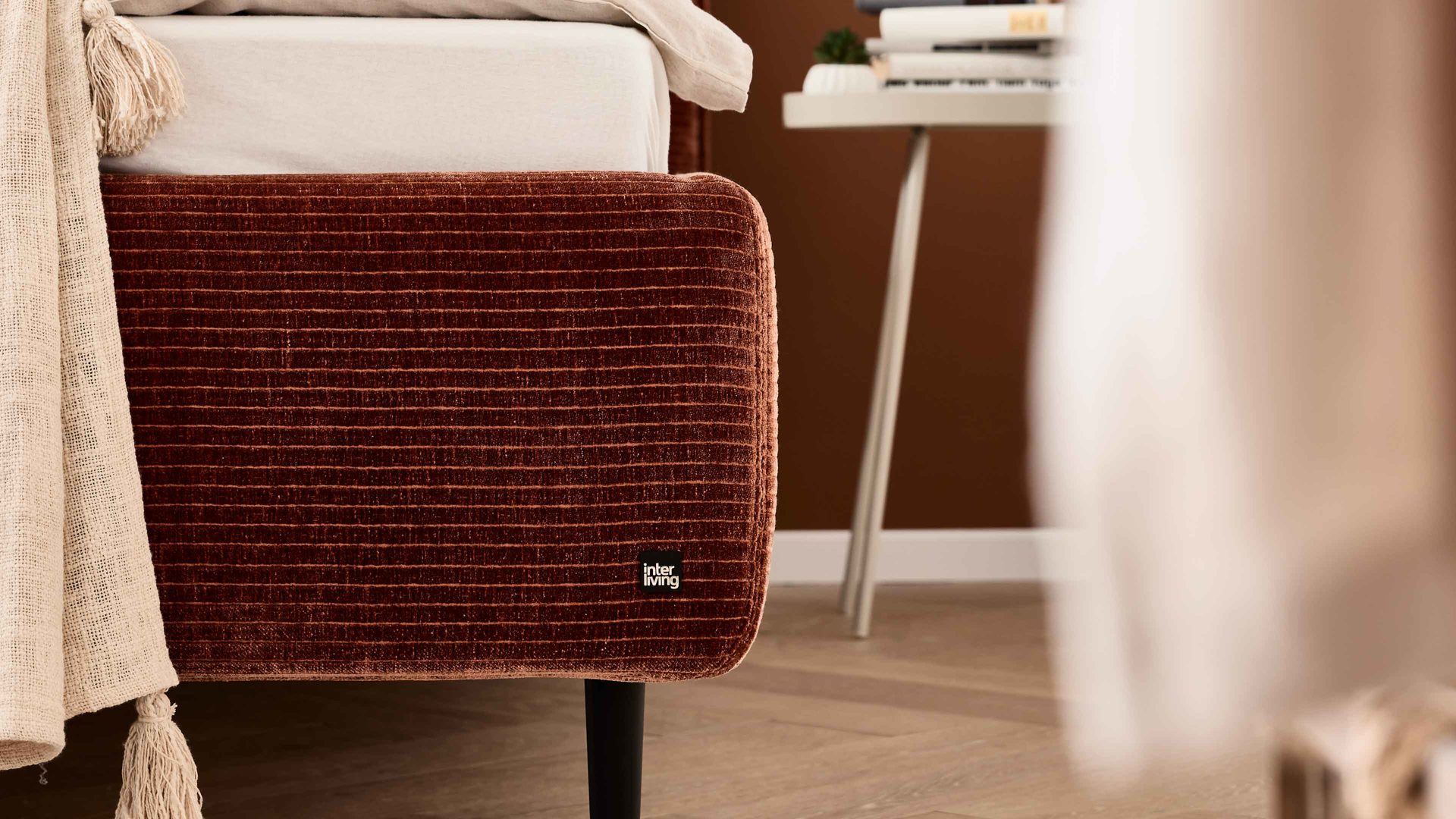 Das Polsterbettgestell aus der Interliving Polsterbett Serie 1417 kombiniert moderne Eleganz, hochwertige Materialien und durchdachte Funktionalität zu einem stilvollen Mittelpunkt im Schlafzimmer. Der modern-rostfarbene Stoffbezug bringt eine warme, einladende Atmosphäre in den Raum, während die mattschwarzen Metallfüße einen eleganten Kontrast setzen und dem Bett eine leichte, moderne Optik verleihen.