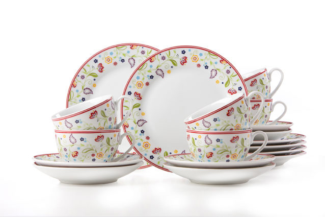 Das Kaffeegeschirr hat 18 Teile, besteht aus hochwertigem Porzellan und ist spülmaschinengeeignet. Freuen Sie sich auf sechs Kaffeetassen mit einem Inhalt von ca. 200 ml, auf sechs Untertassen mit einem Durchmesser von ca. 15 cm und sechs Kuchen- bzw. Dessertteller mit einem Durchmesser von ca. 20,5 cm. Passend zu diesem Kaffeeservice erhalten Sie im Shop ein gleichnamiges 12-teiliges Tafelservice.