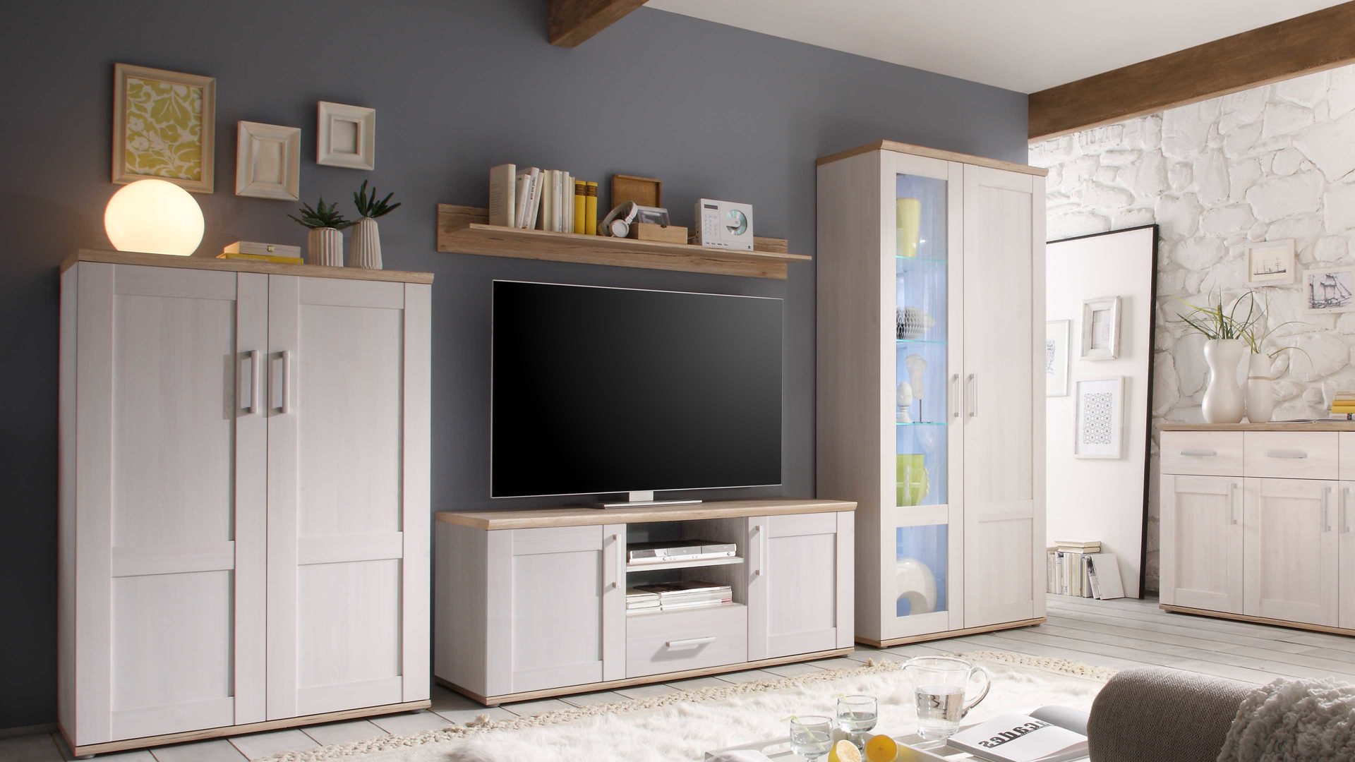 Ein Einrichtungstraum im skandinavischen Landhausstil ist diese vierteilige Wohnwand, die Maße von ca. 329 x 200 x 50 cm (BxHxT) aufweist. Gefertigt wurde sie aus Sibiu Lärche-Nachbildung in Kombination mit hellen San Remo Kunststoffoberflächen. Ein stattlicher Vitrinenschrank mit einer Holztür sowie einer Glastür, Maße ca. 93 x 202 x 46 cm (BxHxT), wird zum Blickfang der Wohnkombination. In seinem Inneren verbergen sich vier Glas- sowie vier Holzböden. Kaltweiße LED-Beleuchtung setzt die Glasböden der Vitrine geschmackvoll in Szene. Ein Wandboard mit Rückwand, Maße ca. 143 x 17 x 24 cm (BxHxT), kann als Abstellfläche für Bücher, DVDs oder Dekoaccessoires genutzt werden.