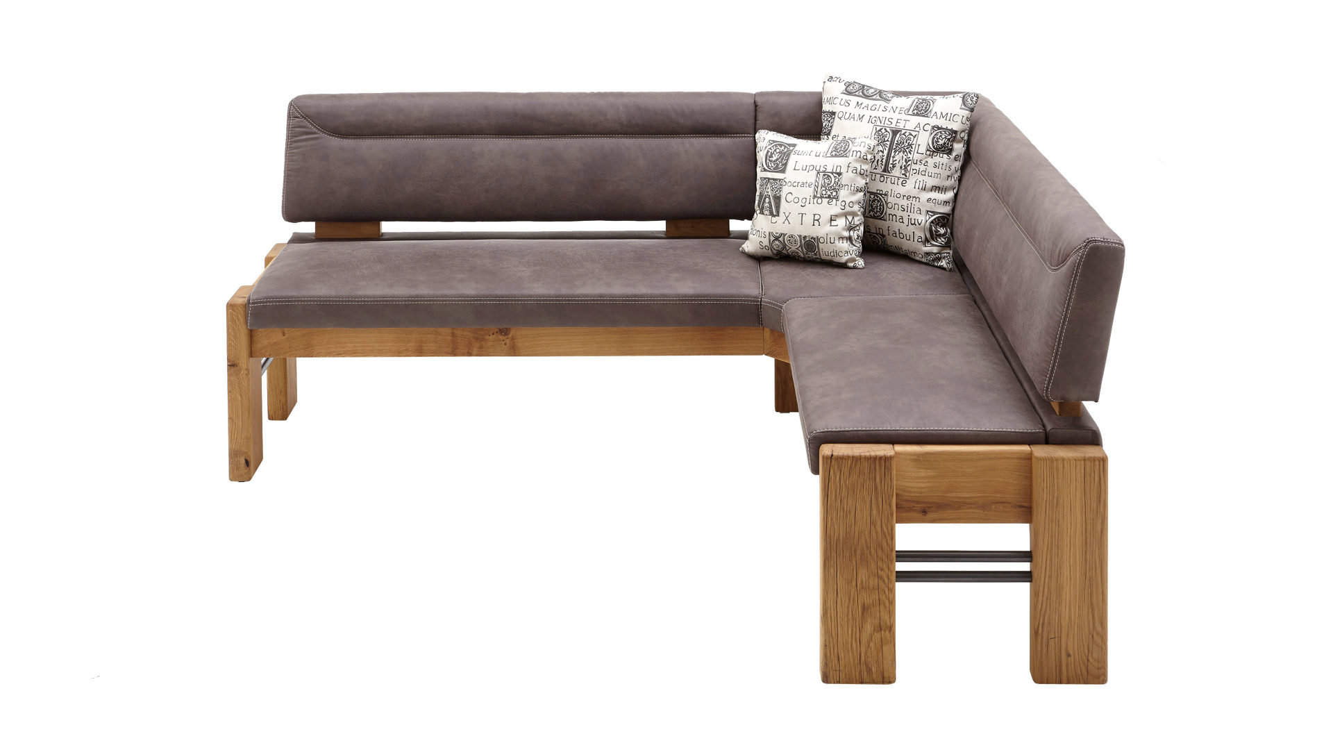 Durch die erstklassige Wellenunterfederung mit weicher Kaltschaumpolsterung sitzen Sie auf der Bank ausgesprochen komfortabel. Auch optisch macht die robuste Polsterbank einiges her. Als stabilisierende Basis fungiert ein Gestell in gerissener Balkeneiche mit naturfarbenem Wachslackeffekt und schwarzen Roheisen-Akzenten mit künstlichen Gebrauchsspuren. Es harmoniert vorzüglich mit dem soften Mikrofaserbezug im speziellen Farbton Elephant. Perfekt abgerundet wird die Eckbank Gino durch die beigefarbene Doppelziernaht.