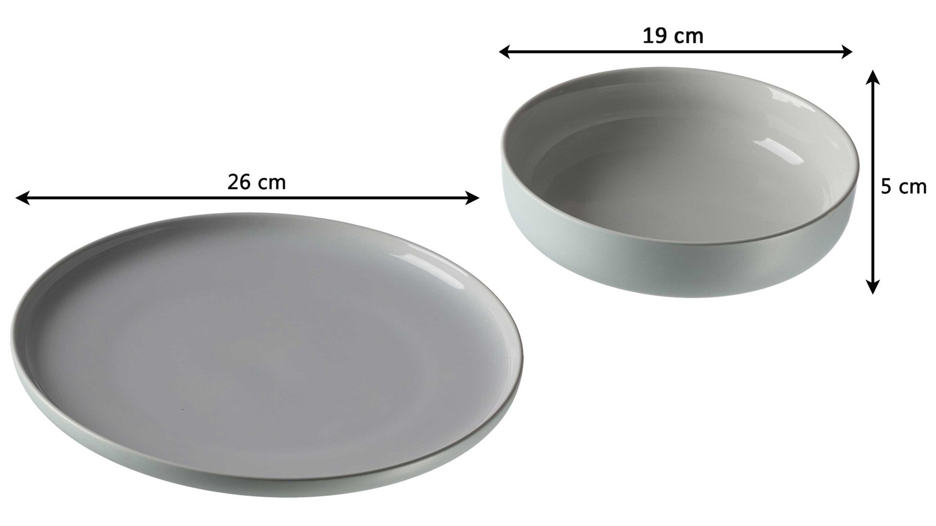Beim stilvollen Essgeschirr handelt es sich um ein achtteiliges Set, das sich aus vier Tellern und vier Schalen zusammensetzt. Die Teller sind jeweils ca. 3 cm hoch und haben einen Durchmesser von ca. 26 cm. Jede Schale ist ca. 5 cm hoch - bei einem Durchmesser von ca. 19 cm.