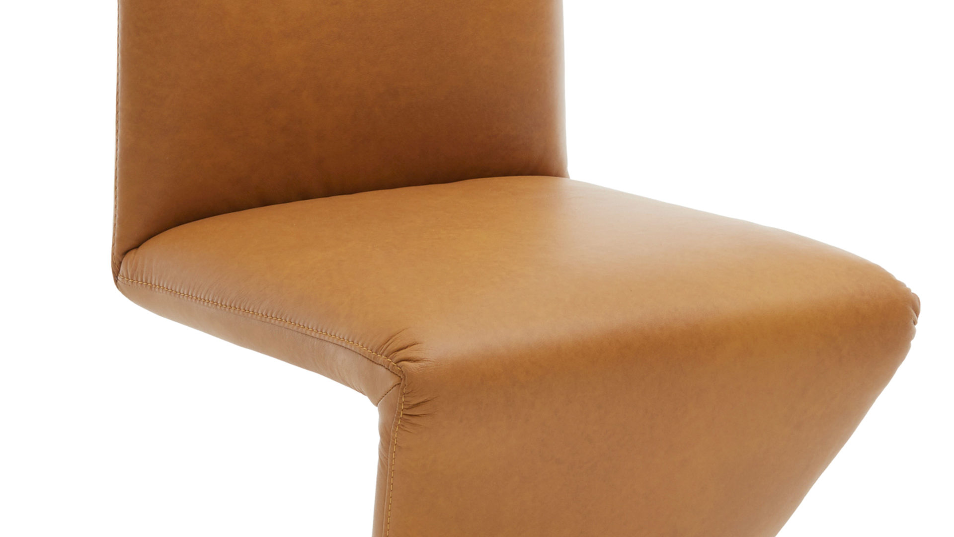 Er setzt sich aus einem schwarz pulverbeschichteten Metall-Tellerfuß mit Struktur und einem curcumafarbenen Lederbezug zusammen. Dank der perfekt aufeinander abgestimmten Materialien und Farben erscheint der Polsterstuhl absolut harmonisch und modern. Des Weiteren sorgen die geradlinige Formensprache, der hinten ebenfalls lederbezogene Rücken und die schicken Zierkappnähte für besonders nobles Flair.
