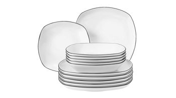 Alle Teller und Tassen sind aus hochwertigem, weißem Porzellan hergestellt. Dessen stilvolle Optik sorgt in Kombination mit der feinen schwarzen Linie im Bereich des Teller- beziehungsweise Tassenrands für eine durch und durch elegante Erscheinung, die den Esstisch ziert.