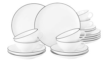 Alle Teller und Tassen sind aus hochwertigem, weißem Porzellan hergestellt. Dessen stilvolle Optik sorgt in Kombination mit der feinen schwarzen Linie im Bereich des Teller- beziehungsweise Tassenrands für eine durch und durch elegante Erscheinung, die den Esstisch ziert.