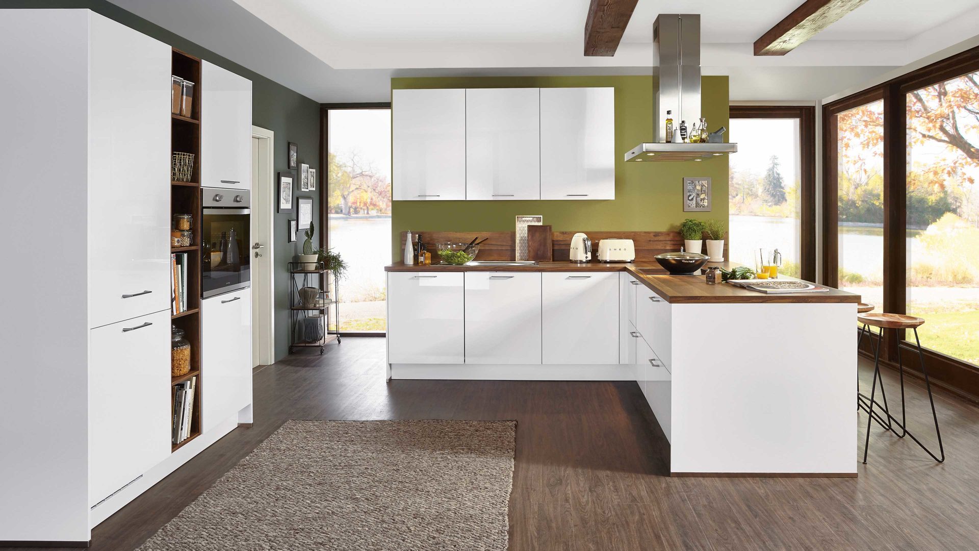 Die Kochinsel mit ansprechender Ansetztheke hat eine Stellfläche von ca. 235 x 218 cm (von links nach rechts) und Schenkelmaße von ca. 185 x 235 x 218 cm (TxLxT, von links nach rechts). Dank der Vielzahl an Schränken mit Türen und Schubladen sowie der offenen Regalbereiche bietet die Einbauküche jede Menge Stauraum für Geschirr und Lebensmittel sowie diverse Küchenutensilien.