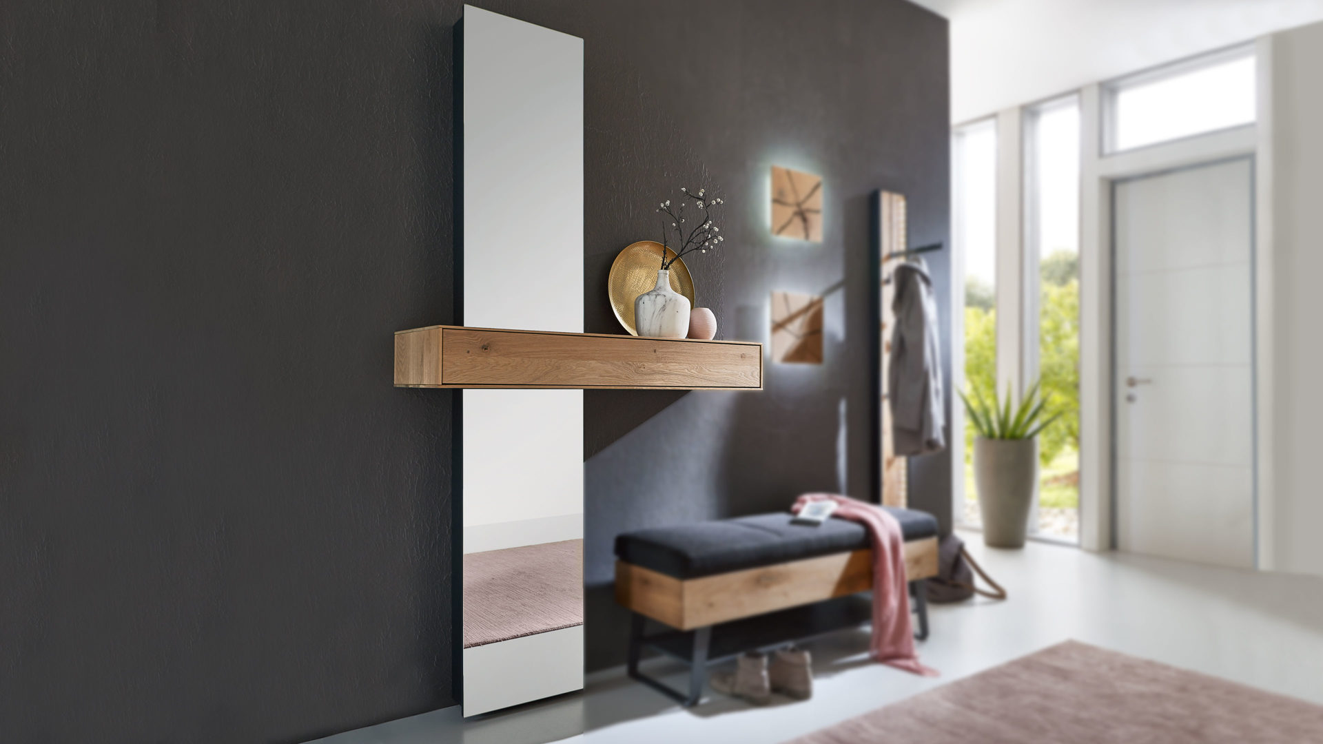 Oben befindet sich eine links angeschlagene Spiegeltür, hinter der drei Klarglasböden und sechs Schlüsselhaken für nützliche Aufbewahrungsmöglichkeiten sorgen. In der Mitte offenbart das Garderobenelement eine Schublade. Demnach bietet der Dielenschrank viel licht- und staubgeschützten Raum für kleinere Gegenstände im Flur. Den unteren Bereich nimmt ein fester Spiegel ein. Die Maße des speziellen, absolut faszinierenden Spiegelschranks betragen ca. 108 x 206 x 39 cm (BxHxT). Ergänzend stehen gegen Mehrpreis eine akzentuierende Innenraumbeleuchtung sowie eine Steckdoseneinheit mit USB-Anschluss zur Verfügung.