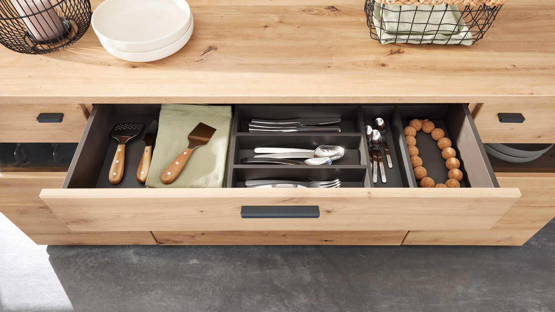 Das Türenelement auf der linken Seite ist links angeschlagen und verfügt über einen Glaseinsatz auf der linken Außenseite. Im Inneren sorgen ein höhenverstellbarer und zwei feste Holzböden für vielseitige Nutzungsmöglichkeiten – perfekt zur stilvollen Präsentation von Gläsern, Geschirr oder Deko. Maße: ca. 45 x 86 x 40 cm (BxHxT). Das Schubladenelement in der Mitte bietet mit vier geräumigen Schubladen reichlich Platz für Besteck, Tischwäsche oder Alltagsutensilien. Dank Soft-Close-Technik schließen die Schubladen leise und sanft – für komfortable Handhabung im Alltag. Maße: ca. 90 x 86 x 40 cm (BxHxT). Das Türenelement auf der rechten Seite ist spiegelbildlich zur linken Vitrine gestaltet – ebenfalls mit einem Glaseinsatz, einem höhenverstellbaren und zwei festen Holzböden. Maße: ca. 45 x 86 x 40 cm (BxHxT).