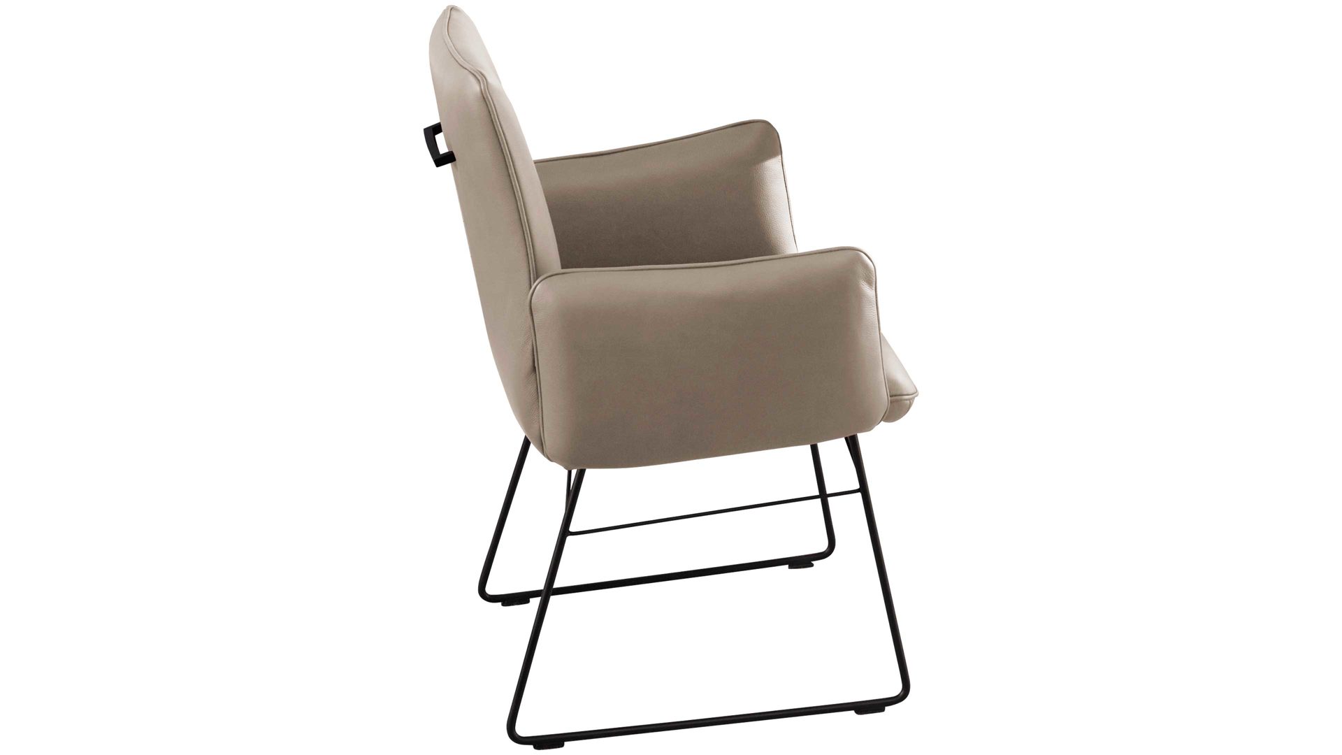 Sitzfläche mit Quadratsteppung, glatt bezogene Rückenlehne mit Metallgriff auf der Rückseite