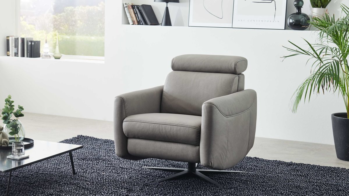 Ein anthrazitfarbener Metall-Sternfuß gewährleistet die nötige Standfestigkeit und veredelt das moderne Design des rundum lederbezogenen und somit von allen Seiten Eleganz verkörpernden Polstermöbels. Die Auszeichnungen mit dem Goldenen M und Blauen Engel zeugen von der hohen Qualität des Fernsehsessels.