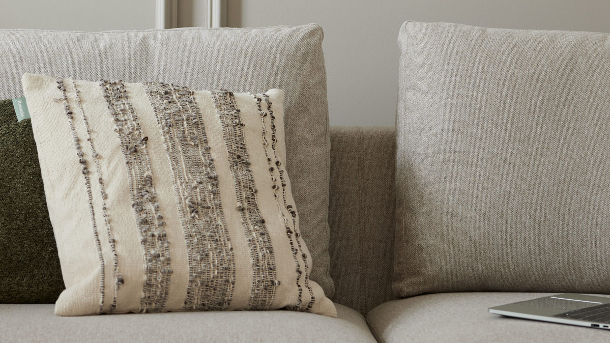 Kissenbezug mit eingenähten schwarzen Wollfäden, unifarbener Rückseite und verdecktem Reißverschluss