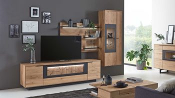 • Die Abbildung zeigt ein Wohnbeispiel, welches auch Dekoration sowie separat erhältliches Zubehör enthält. Im Lieferumfang enthalten ist eine vierteilige Wohnwand.